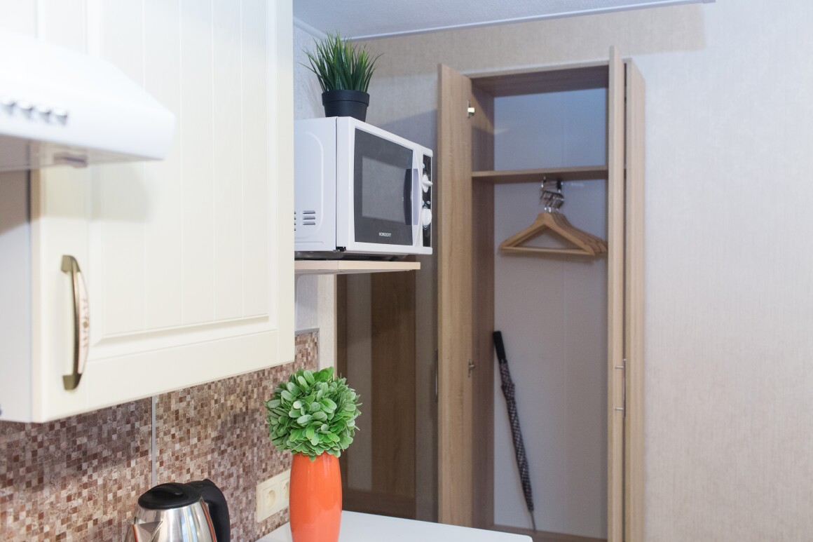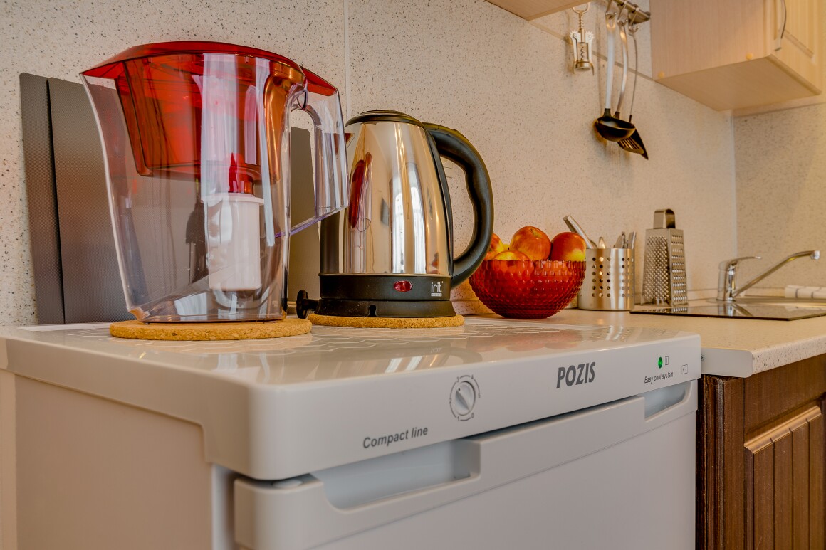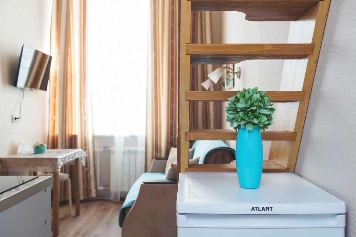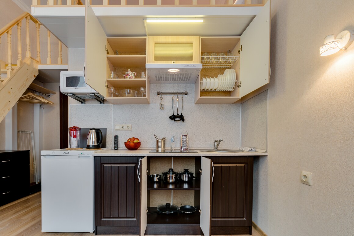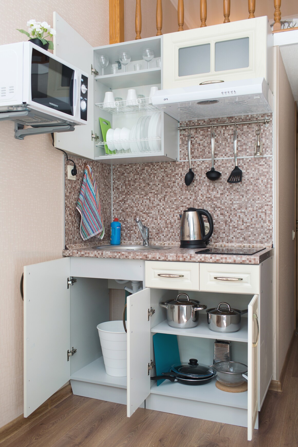 - Апартаменты с мини-кухней , электрическим чайником и плитой. Вид во двор.