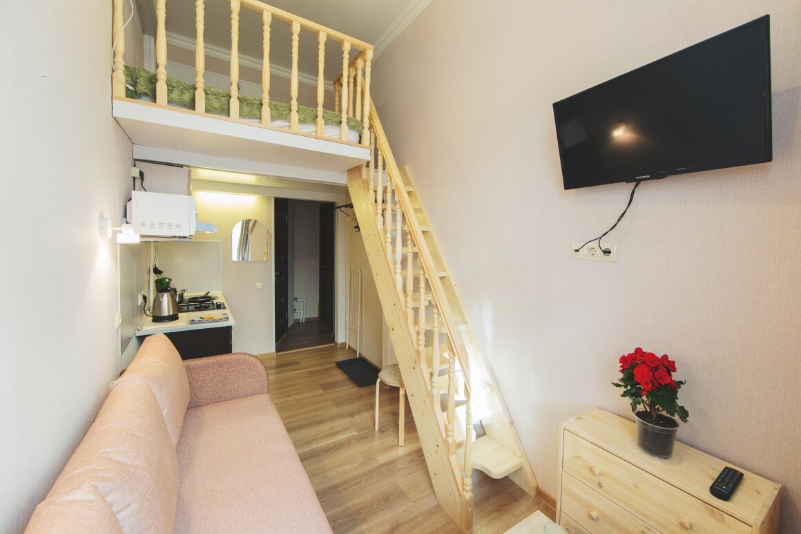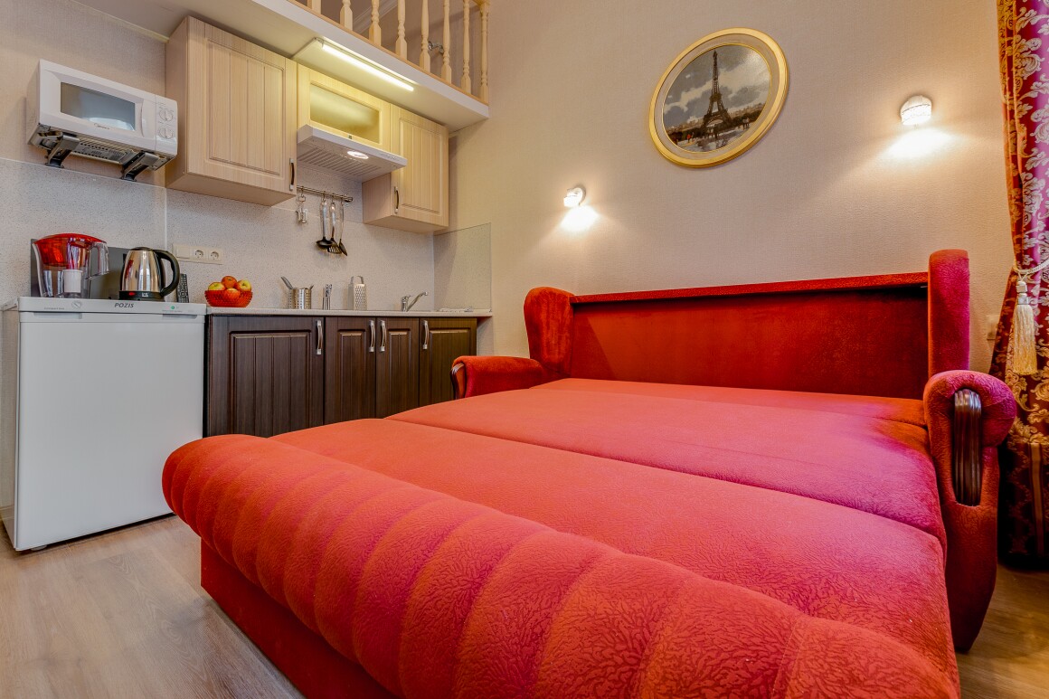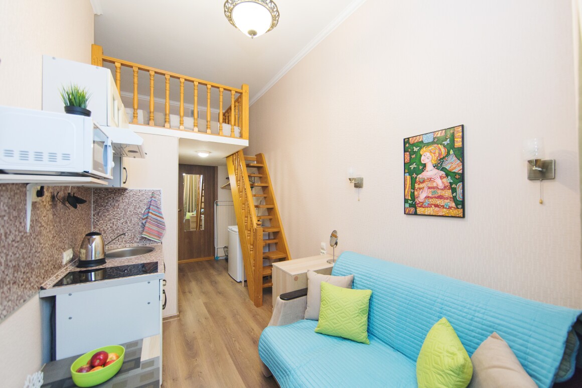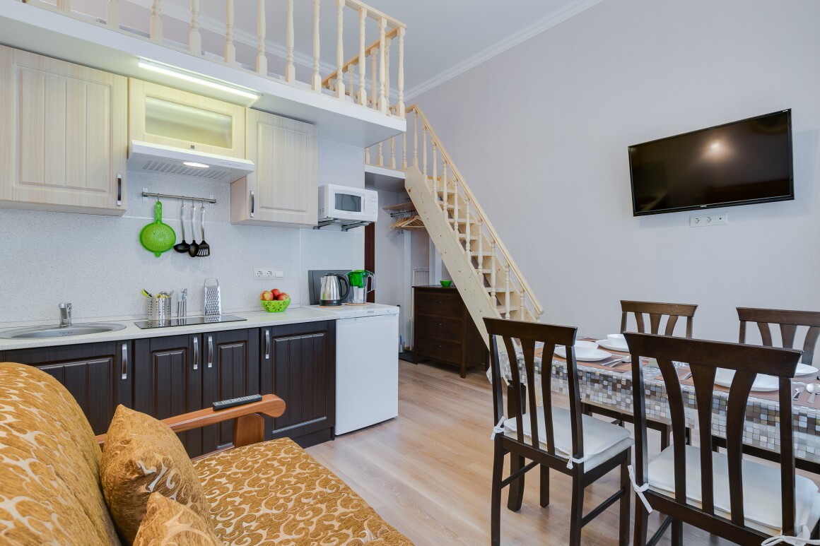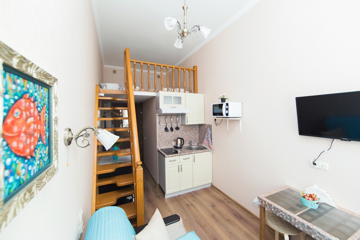 - Апартаменты с мини-кухней , электрическим чайником и плитой. Вид на улицу Пушкинскую.