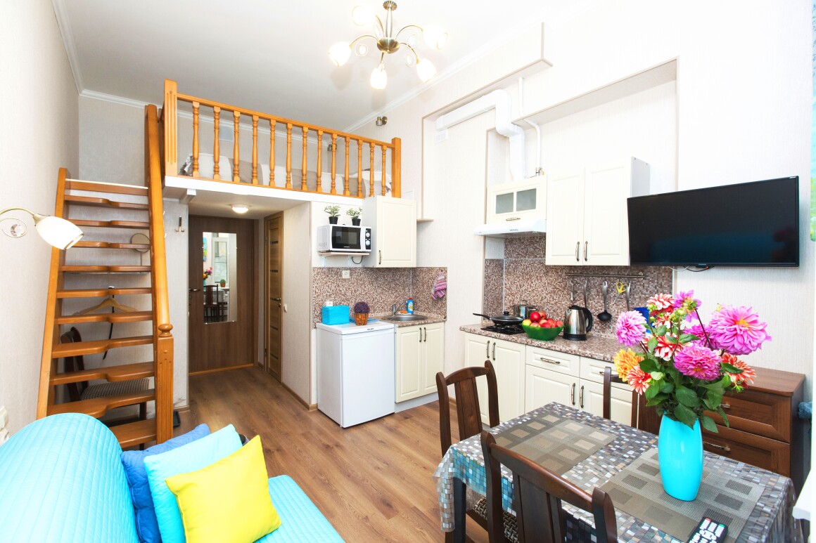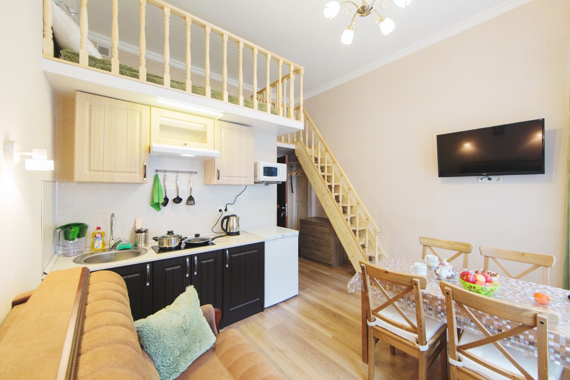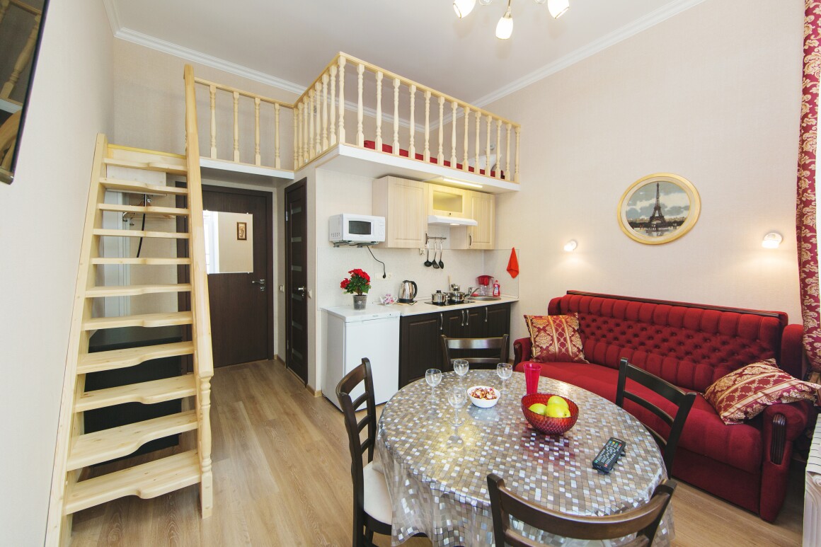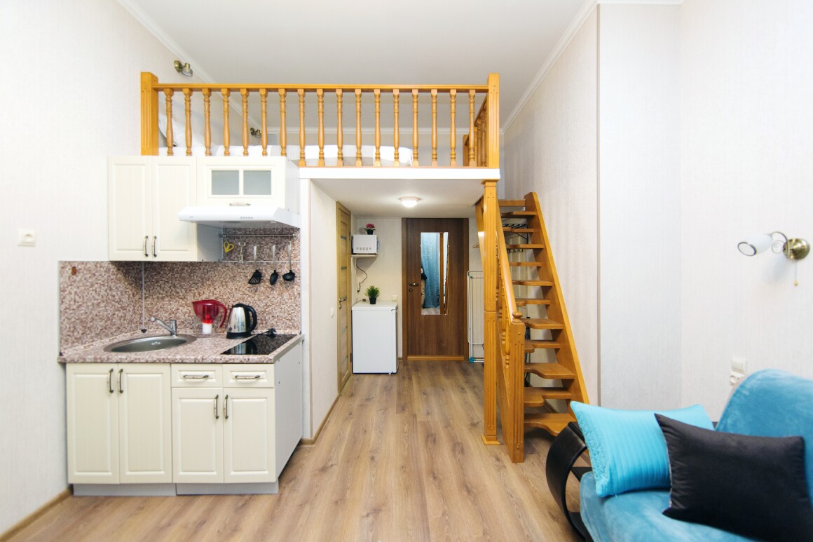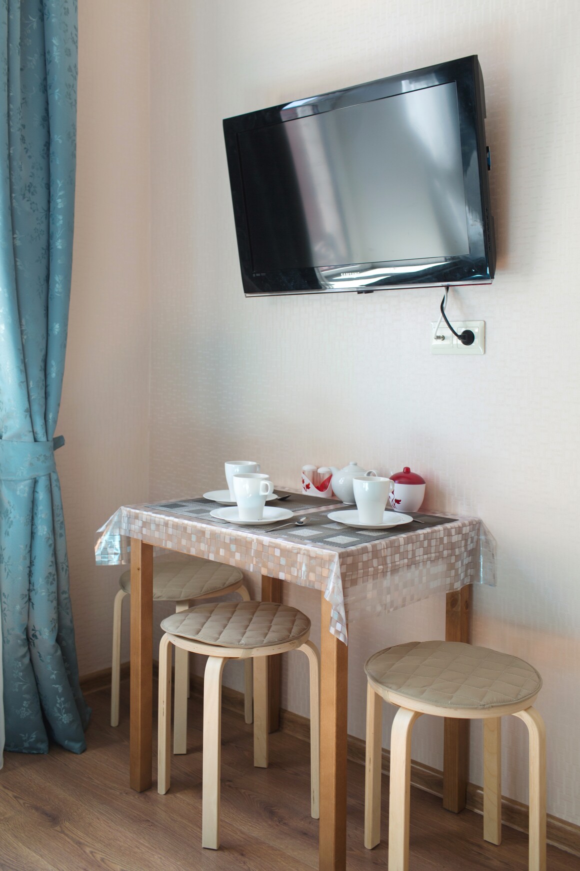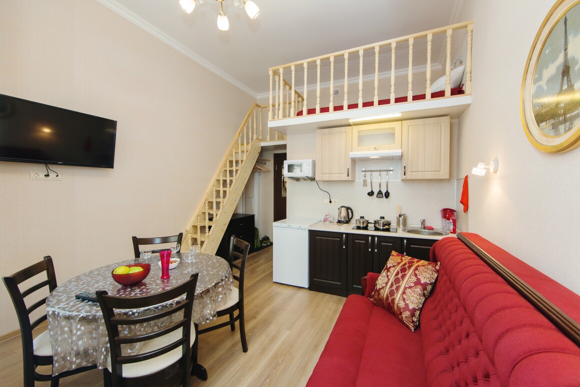 - Апартаменты с мини-кухней , электрическим чайником и плитой. Вид на улицу Пушкинскую.