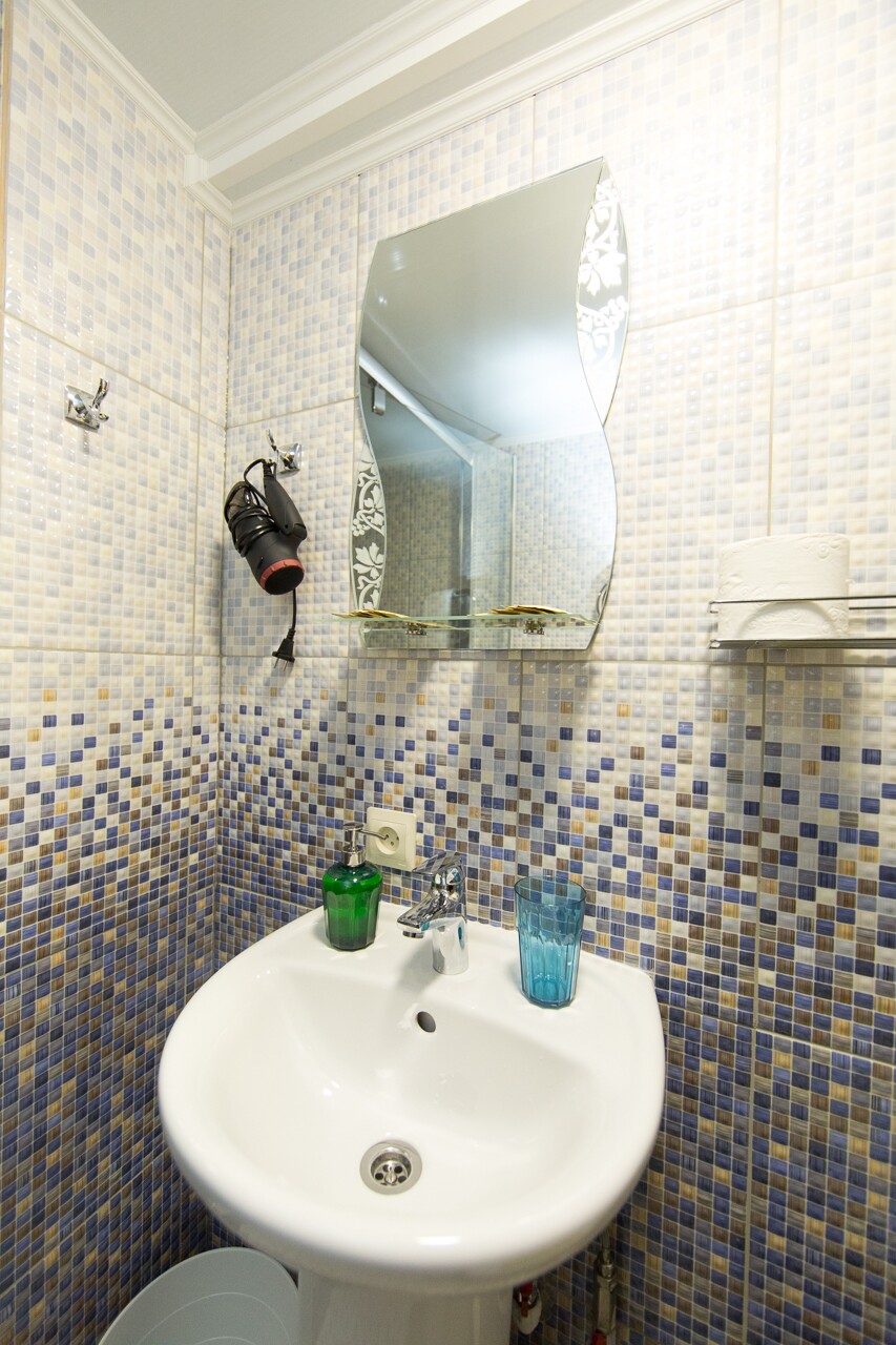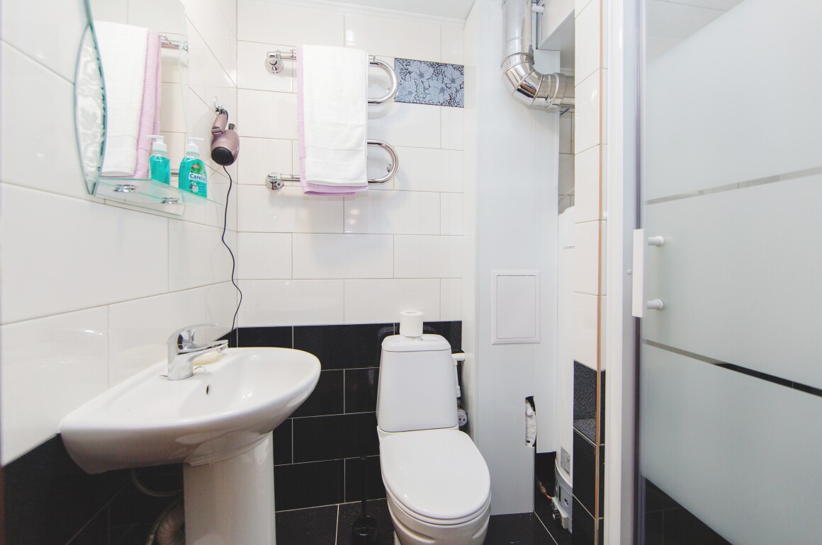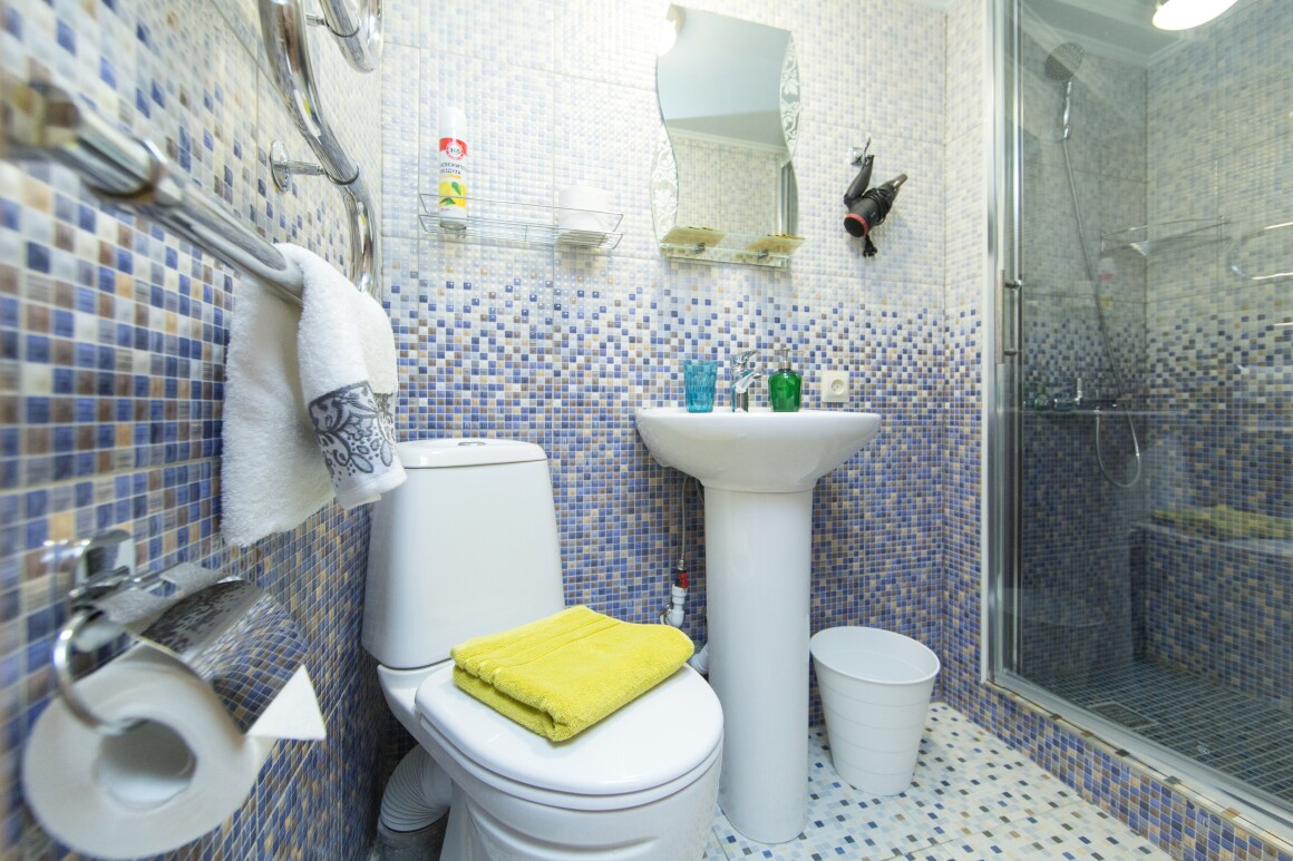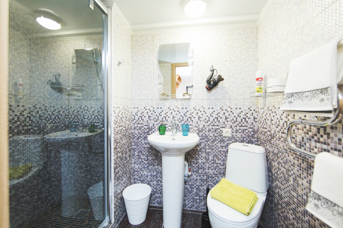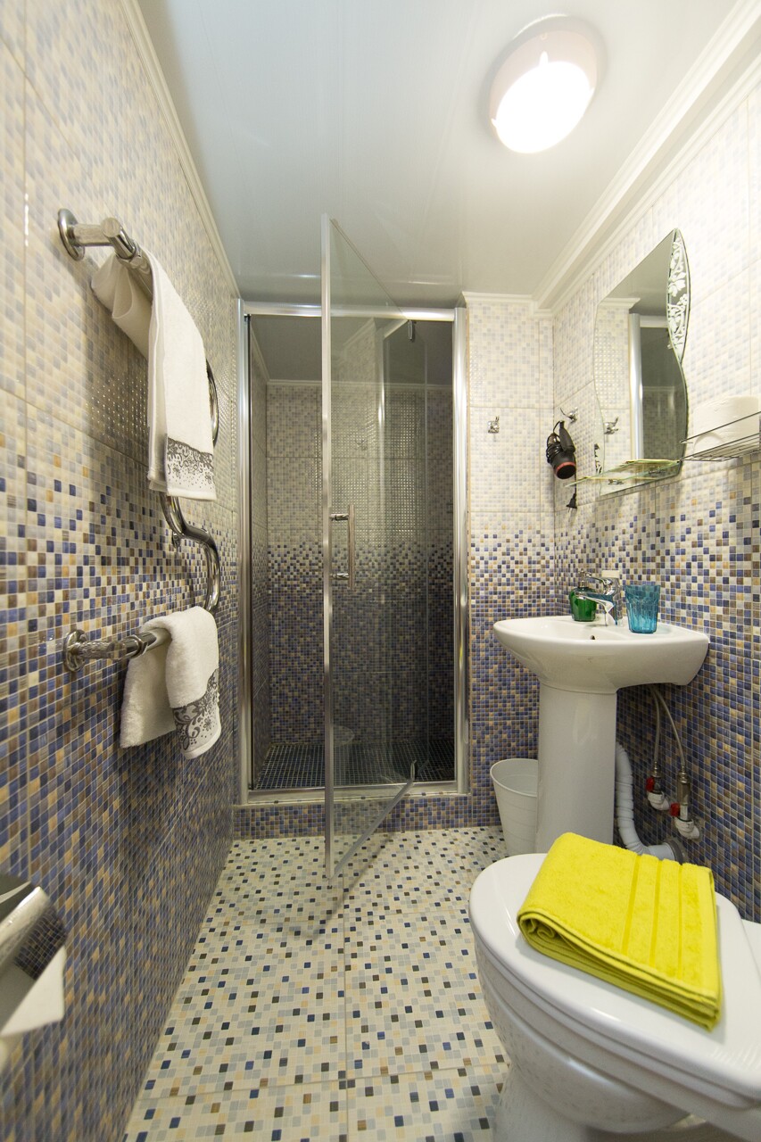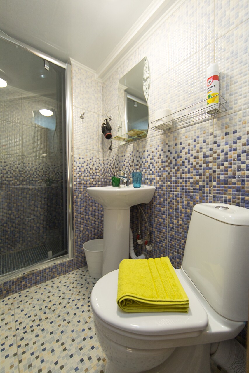 - На 1 уровне: Диван-кровать, Душевая кабина, Туалет, Фен, Утюг, Мини-кухня, Посуда, Плита, Холодильник, Гладильные принадлежности, Бесплатные туалетные принадлежности (шампунь, мыло), Туалетная бумага, Микроволновая печь, Стиральная машина, Тапочки, Спутниковые каналы, Телевизор с плоским экраном, Звукоизоляция, Электрический чайник, Кухонные принадлежности, Полотенца, Белье, Обеденный стол, Вешалки для одежды, Комод, Сушилка для обуви, Зонт, Корзины для мусора, Бесплатный Wi-Fi