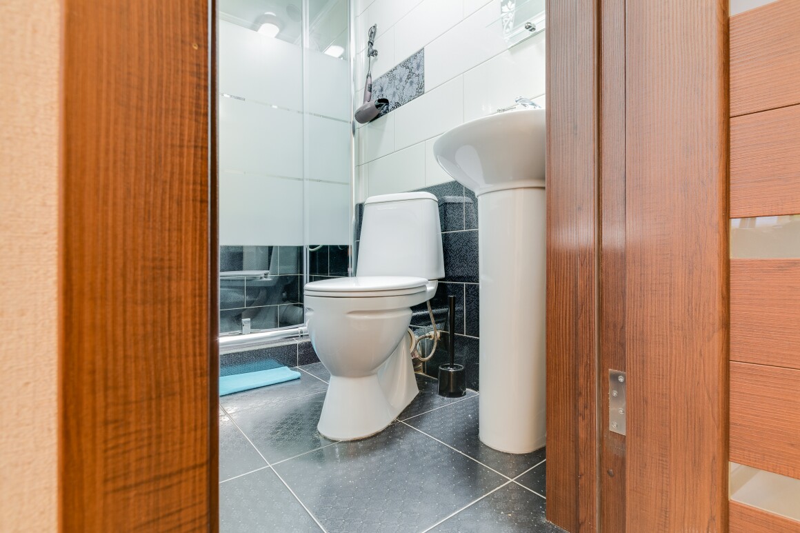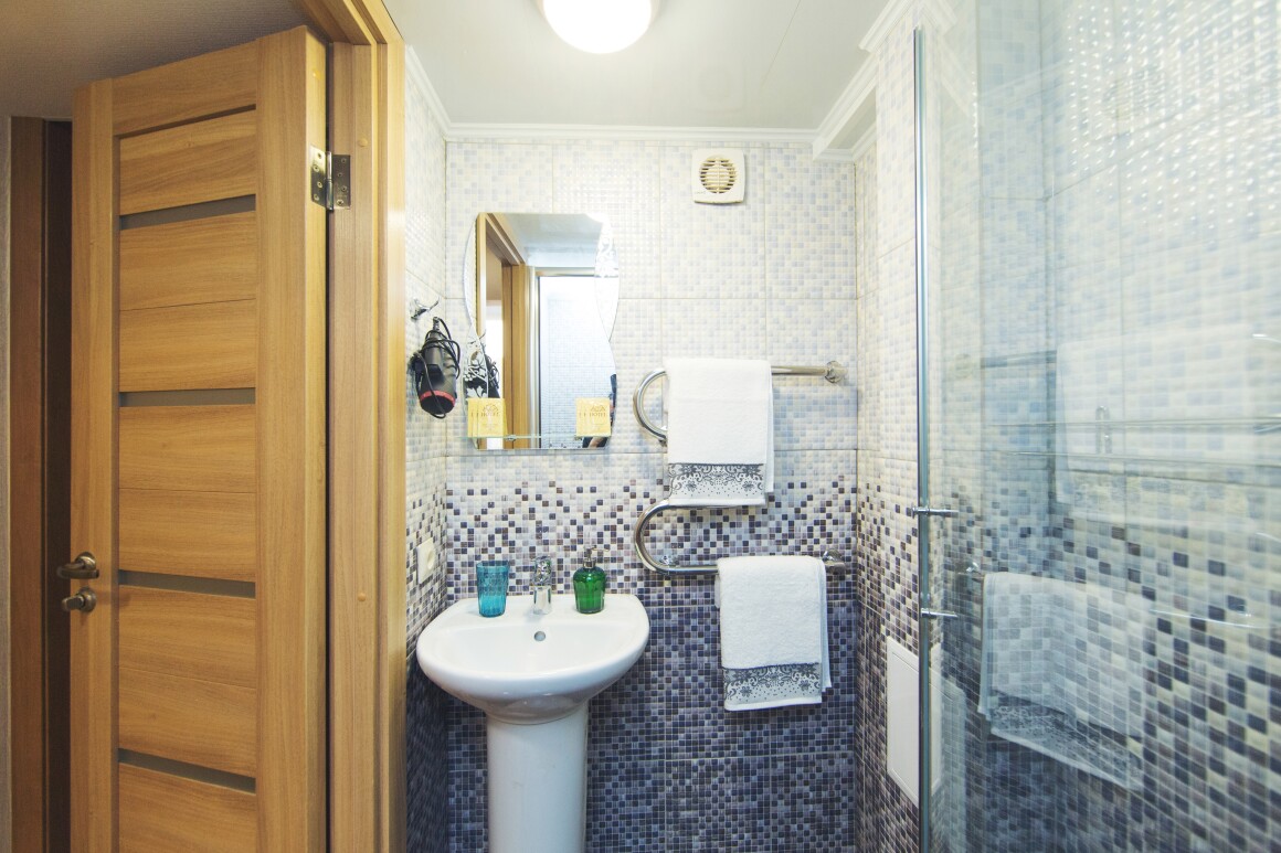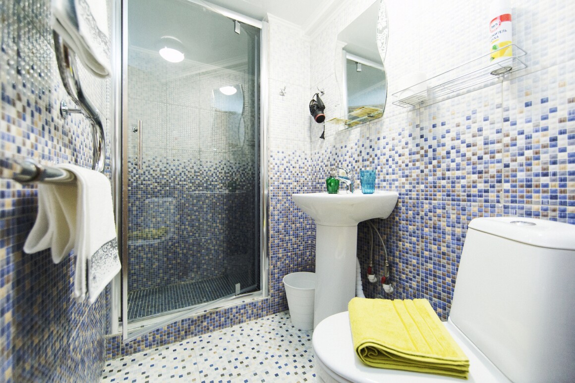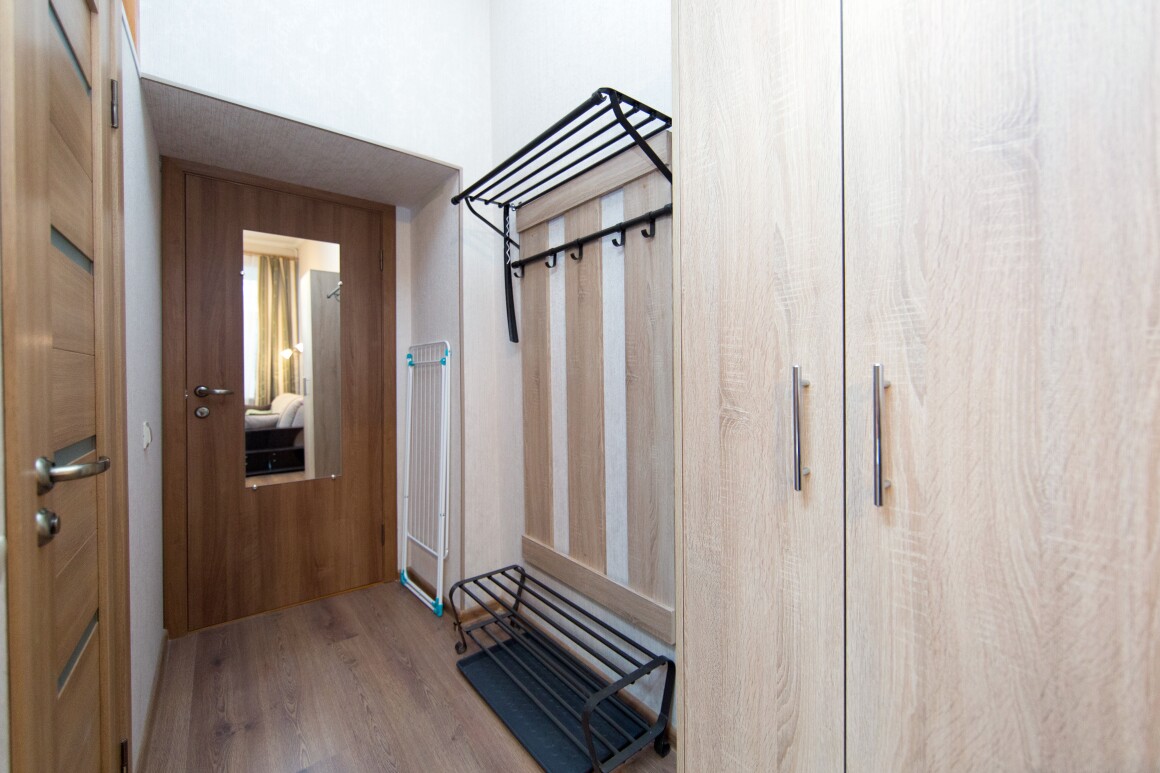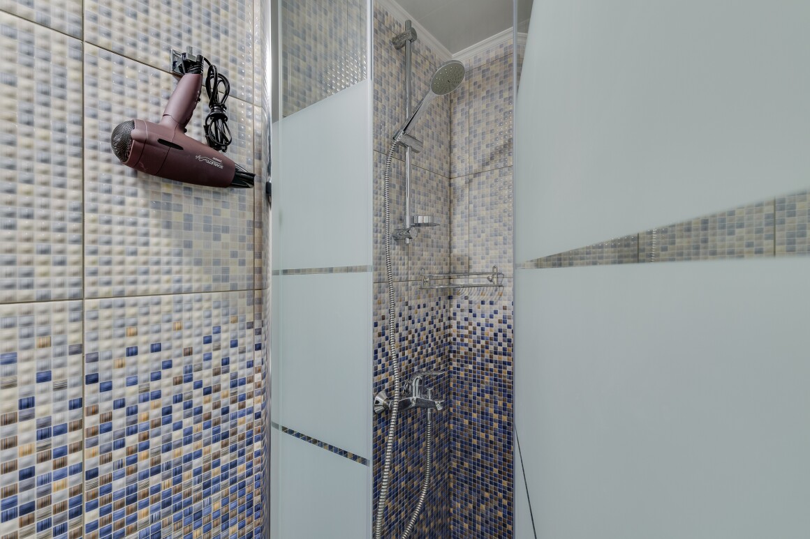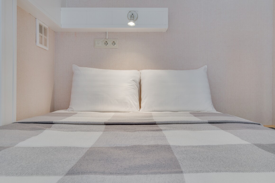 - На 1 уровне: Диван-кровать, Душевая кабина, Туалет, Фен, Утюг, Мини-кухня, Посуда, Плита, Холодильник, Гладильные принадлежности, Бесплатные туалетные принадлежности (шампунь, мыло), Туалетная бумага, Микроволновая печь, Стиральная машина, Тапочки, Спутниковые каналы, Телевизор с плоским экраном, Звукоизоляция, Электрический чайник, Кухонные принадлежности, Полотенца, Белье, Обеденный стол, Вешалки для одежды, Комод, Сушилка для обуви, Зонт, Корзины для мусора, Бесплатный Wi-Fi